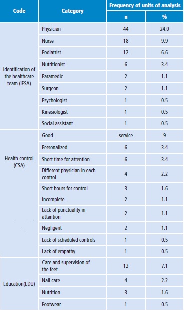 Physicians are frequently identified as participants of the healthcare team, followed in order by nurses, podiatrists, nutritionists, paramedics, surgeons, physiotherapists, psychologists and social assistants. Additionally, activities related to the healthcare team are education, taking good care of the feet and nails, diet and appropriate footwear. About health controls, good personalized attention was reported, as well as short periods spent in care, which are insufficient and done by different doctors in each control; an exclusive physician for each patient was suggested.