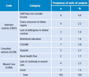 Likewise, the vast majority of key informants reported that they have received nutritional education, but aspects such as income are not considered, hindering adherence to the regimen due to low family income and the implicit expenses derived from the treatment of DF ulcers. This coincides with a study stating that compliance with dietary recommendations was mostly partial. 36 The findings of this work may be related to the fact that the healthcare team does not know the characteristics and problems of the population and, therefore, care, indications and education have not been adapted to the real context of users to respond accurately to their needs. It should be borne in mind that medical and dietary treatment influence dietary behavior, so health professionals must consider sociocultural determinants when designing and implementing treatment strategies. 36