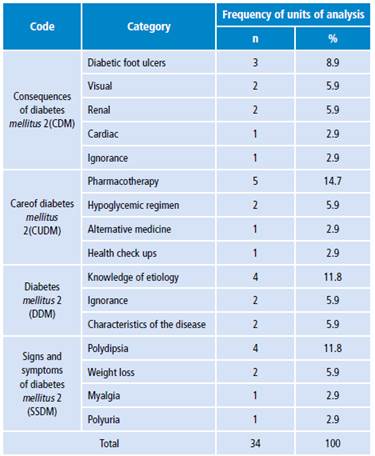 Most of the informants reported that protocolized activities carried out by the healthcare team 35, including health checkups, have a good but short personalized attention and that the rotation of physicians implies the lack of follow-up and constant changes in indications. Furthermore, they expressed difficulties for obtaining appointments, lack of punctuality in attention, failure to comply with the appointments and, finally, stressed the lack of empathy of some people who perform the interventions. This may be related to work overload in employees, since the time allocated for consultation (30 minutes) is insufficient to address this type of user. It could be assumed that the aforementioned factors reflect the flaws of knowledge acquired, since not all necessary activities described to prevent the complications of DM2 are fulfilled 29, reflecting again the importance of health education in relation to the needs of users.
