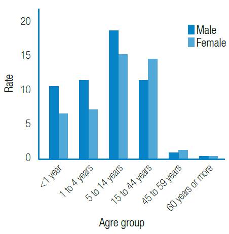 In the period between January 2010 and August 2014, 243 883 patients were treated achieving about 25.9% coverage for the department of Risaralda and its area of influence. Regarding this population (n=243 883), records related to congenital anomalies were found in 7 529 patients (3.08%, 95% CI 3.0-3.1). Of 7 529 patients with anomalies, 19.5% (95%CI 18.6-20.4) (n=1 494) had craniofacial malformations. The distribution of cases according to the variable of age and sex is shown in Figure 1.