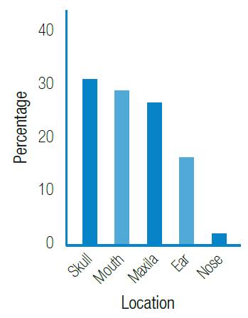 A higher rate of craniofacial anomalies was observed in the age group of 5-14 years, which comprises 33.4% of the cases. The male sex is predominant with 58.4%, and a higher rate of diagnoses for both sexes was observed in the age group of 5-14 years. As for location, the distribution is presented in Figure 2.