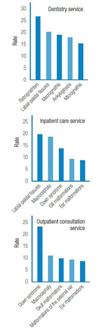 However, the order of diagnostic frequency varies according to the health service that treats the patient. Figure 3 shows this variation, with a greater proportion of retrognathism and cleft lip and palate diagnoses by the dentistry service, higher diagnosis of fissures and macrocephaly by the inpatient care service, and more Down syndrome, macrocephaly and skull deformities diagnosis by the outpatient consultation service. Regarding chromosomopathies, 79% of cases are Down syndrome.