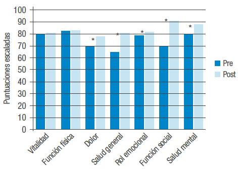 En cuanto a la medición de la calidad de vida, la Figura 2 muestra cómo mejoraron significativamente las variables dolor, salud general, salud emocional, función social y salud mental. Las variables vitalidad y función física no exhibieron cambios.