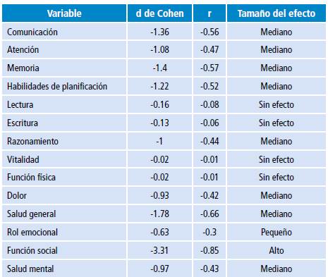 Resultados: Se evidenciaron mejorías significativas en la mayoría de los dominios evaluados (comunicación, atención, memoria, habilidades de planificación y razonamiento) y en algunas de las variables relacionadas con la calidad de vida tales como dolor, salud general, rol emocional, función social y salud mental.