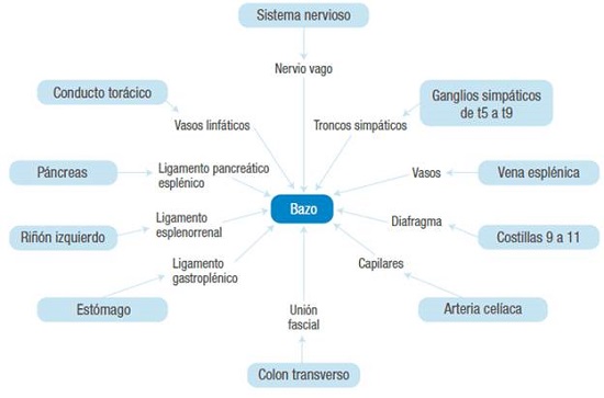 Desde esta perspectiva, se puede comparar el cuerpo humano con un gran sistema donde existen múltiples nodos o elementos estáticos y múltiples conexiones como elementos dinámicos, infiriendo que los elementos que tengan mayor cantidad de conexiones serán aquellos con más capacidad de compensación ante la intervención del entorno y a su vez estarán más expuestos a ser disfuncionales o producir una serie de disfunciones por el gran número de interacciones que intervienen en un elemento estático; así también se puede inferir que mientras más conexiones posea un elemento estático, más relevante es la estructura para el organismo. La Figura 1 muestra el ejemplo del sistema complejo del bazo.
