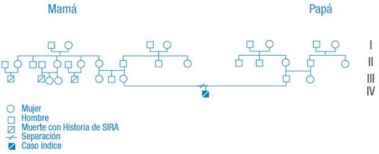 Paciente masculino de 8 meses de edad, nacido a término, negativo para síndrome de TORSCH (toxoplasmosis, rubeola, citomegalovirus y herpes) y con vacunación completa para la edad. El niño presentaba retraso del neurodesarrollo y antecedentes familiares de infección recurrente en tercer grado de consanguinidad. Se realizó familiograma y se encontró un patrón de herencia recesiva ligado al cromosoma X (Figura 1).
