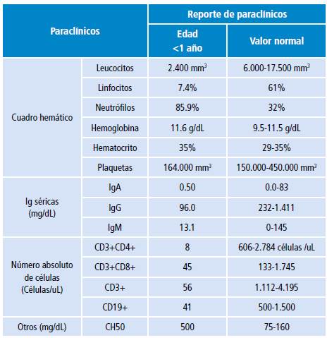 El paciente presentó múltiples hospitalizaciones por infecciones recurrentes que se caracterizaron por presencia de candidiasis oral desde los dos meses de edad. A los cuatro meses el paciente ingresó por síndrome febril, hepatoesplenomegalia y pancitopenia (Tabla 1).