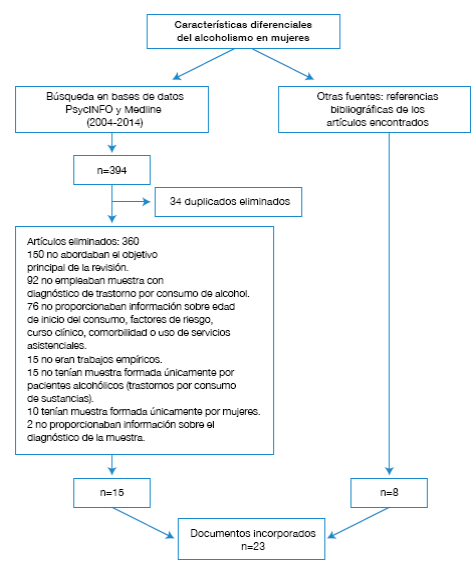 Se realizó una búsqueda en las bases de datos PsyclNFO y Medline desde enero de 2004 hasta diciembre de 2014. Las palabras clave utilizadas fueron: "alcoholism" OR "alcohol" AND "women" OR "gender differences". También se revisó de forma manual la bibliografía de los artículos encontrados.