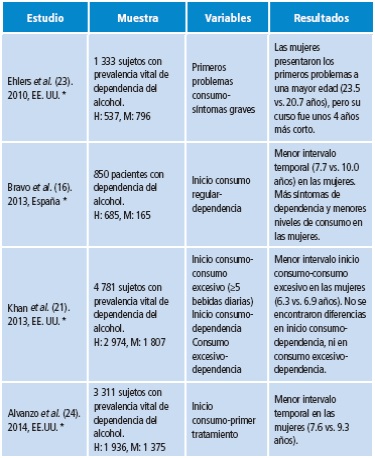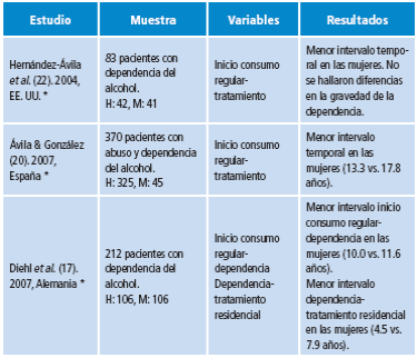 Como muestra la Tabla 2, con excepción la investigación de Khan et al.21, en todos los demás estudios las mujeres presentaron una historia de consumo más corta hasta la aparición de problemas relacionados con el alcohol tales como la dependencia.