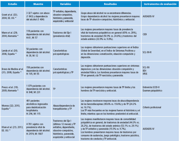 Los resultados sobre los trastornos antisocial, narcisista y paranoide son contradictorios. Tres estudios hallaron mayores tasas de trastorno antisocial en los hombres 18,21,33, mientras que Grant et al.33 identificaron que este trastorno fue más prevalente en las mujeres. En relación con el trastorno narcisista, si bien Khan et al.21 informaron de una mayor prevalencia en las mujeres, dos estudios encontraron tasas de prevalencia superiores en los hombres 18,31. Respecto al trastorno paranoide, Bravo de Medina et al.31 encontraron mayores tasas de prevalencia en los hombres con dependencia del alcohol, mientras que Khan et al.21 descubrieron una mayor prevalencia en las mujeres.