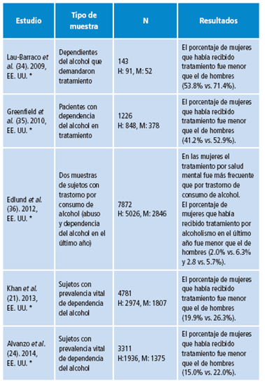 En todas las investigaciones se examinó el uso previo de servicios asistenciales para el tratamiento del alcoholismo. Los resultados indicaron que el porcentaje de mujeres que habían recibido tratamiento previo para el alcoholismo era 6-18% menor que el de hombres 21,24,34,35. Respecto al último año, Edlund et al.36 encontraron que el tratamiento por salud mental (depresión o ansiedad) fue más frecuente que el tratamiento por alcohol en mujeres con este trastorno. El porcentaje de mujeres que habían recibido tratamiento por problemas de alcohol en el año anterior a la realización del estudio fue menor que el de hombres (5.9% vs. 9.5% en el grupo de sujetos con diagnóstico de abuso de alcohol y 7.6% vs. 8.3% en el grupo de sujetos con dependencia del alcohol).