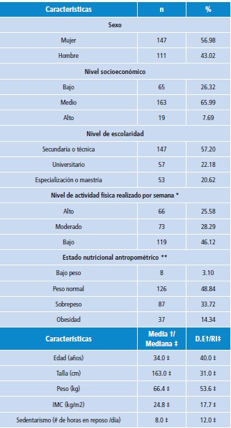 Un total de 258 trabajadores fueron estudiados (tasa de respuesta de 21.3%). El 56.98% eran mujeres y la mediana de edad fue 34 años (rango intercuartílico, RI: 40 años). Se puede observar en la Tabla 1 que la mayoría de los encuestados pertenecía al nivel socioeconómico medio (65.99%) y tenía un nivel de escolaridad menor al universitario (57.20%).