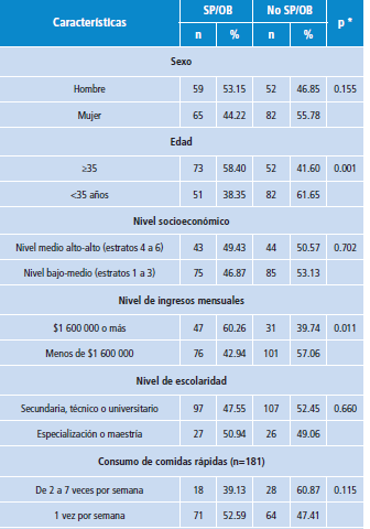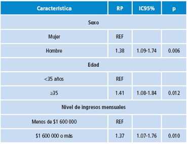 En el análisis multivariado, tres variables se asociaron significativamente con sobrepeso y obesidad: tienen mayor riesgo de presentar sobrepeso u obesidad las personas de sexo masculino, quienes tienen 35 años de edad o más y quienes tienen ingresos mensuales superiores a $1 600 000 pesos colombianos (Tabla 3).