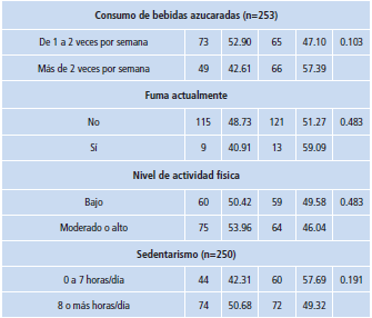 Respecto a los estilos de vida, el nivel de actividad física que realizan por semana es bajo en la mayor parte de los casos (46.12%), la mediana de sedentarismo es 8 horas al día (RI=12 horas), el 25.41% consume comidas rápidas de 2 a 7 veces por semana, 70.37% consume frutas solo una vez al día, 83.64% consume verduras solo una vez al día y 8.53% son fumadores.