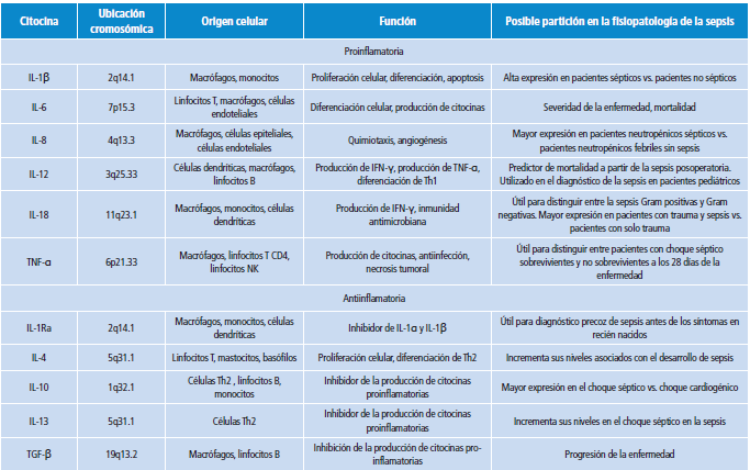 Las citocinas se consideran mensajeras fisiológicas de la respuesta inmune, son activas en bajas concentraciones y se unen a receptores específicos en diferentes células, lo que ocasiona la liberación de mediadores secundarios y de otras citocinas, así como la expresión de múltiples moléculas que permiten la activación de diferentes poblaciones celulares 6-9,43. Diversos estudios han relacionado la presencia de ciertos polimorfismos en los genes que las codifican con la susceptibilidad a infecciones, las diferentes formas clínicas de la sepsis y la mortalidad 44-57.