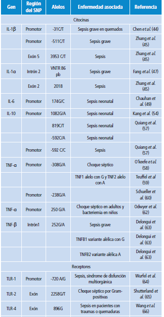 Diversos estudios relacionan el polimorfismo genético de más de 30 genes con el desarrollo de sepsis, sepsis grave y choque séptico. En esta revisión se describen 20 de estos genes que codifican para las citocinas proinflamatorias, receptores celulares, enzimas, mediadores químicos, entre otros 41,42.