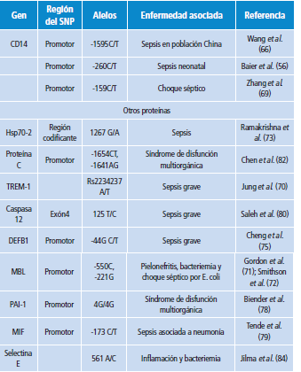 Variaciones nucleotídicas específicas también han sido detectadas por las proteínas que participan en la respuesta inflamatoria durante la infección en los genes que codifican. Tales variaciones se relacionan con susceptibilidad al desarrollo de la sepsis y progresión de la enfermedad 12,41,42.