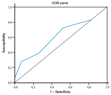 There was no loss of follow-up at 7 or 30 days. For prediction of primary outcome -major, serious and death-, the ROSE risk score showed sensitivity, specificity, PPV and NPV of 60%, 18.18%, 6.25% and 83.33% respectively. The area under the ROC curve was 0.62 (95%CI: 0.45 to 0.78) (Figure 1 and 2).