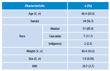 During the August 2013 - February 2014 period, 60 patients were selected. The average age was 66.47±20.3 and 56.7% (n=34) of the population were females. Demographic characteristics are shown in Table 1.
