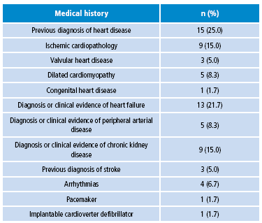 In this population, 31.7% (n=19) had previous syncopal events; of these, 42% (n=8) registered a single syncopal event in the last six months, 15.8% (n=3) two episodes and 36.9% (n=7) three or more episodes. Other frequent antecedents were previous heart disease (25%) and heart failure diagnosis (21.7%) (Table 2).
