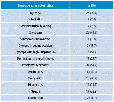 The study was approved by the ethics and research committees of the two institutions involved and patients signed an informed consent to participate. Follow-up was conducted through the review of medical records, if the patient was hospitalized during the follow-up period or by telephone, if the patient had been discharged. A descriptive analysis of demographic characteristics, data specific to the syncopal event, history, physical examination and paraclinical exams requested at admission was made.