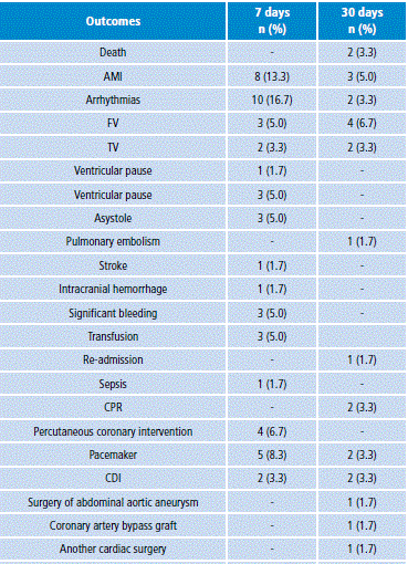 The following were considered as adverse outcomes: death, acute myocardial infarction, need for percutaneous or surgical coronary revascularization, severe aortic stenosis, aortic dissection, cardiac tamponade, pulmonary embolism, dilated cardiomyopathy with a left ventricular rejection fraction of <35%, diagnosis of major bradyarrhythmias and electrotherapy -pacemaker implant, pauses longer than three seconds, 2:1 AV Block, Type II Mobitz AV block, complete AV block, bradycardia under 30 bpm, alternating bundle branch block, pacemaker malfunction related to capture fault-, diagnosis of tachyarrhythmia -ventricular or sustained supraventricular tachyarrhythmia-, defibrillator implant, cardiac resynchronization therapy device implant, malfunction of cardioverter-defibrillator or cardiac resynchronization therapy device due to inadequate treatment of sustained ventricular arrhythmias, significant bleeding -need for transfusions, endoscopy requiring endoscopic treatment due to bleeding or need for surgical intervention due to bleeding-, lesions after the syncopal event that could affect life -head trauma, spinal fracture or long bones- and emergency readmission.