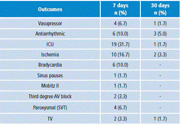 The physical exam at admission found mainly: systolic blood pressure of 125.1±23.3 mmHg, diastolic blood pressure of 72.5±13.7 mmHg, heart rate of 68.5±17.7 bpm, respiratory rate of 19.6±9.5 rpm and oxygen saturation of 90.05±12.4%. Electrocardiogram at admission found alterations in 76.7% (n=46).