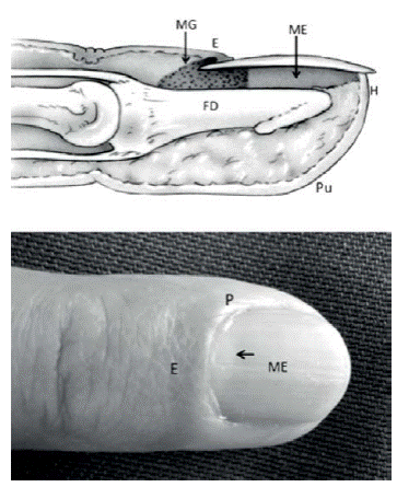 Nails play several important roles in hand function: they protect the dorsal surface of the distal phalanges, increase the sensitivity of the fingertip, facilitate grabbing small objects and have an important aesthetic role. In order to plan appropriate treatment of traumatic lesions of the nails, thorough knowledge of their anatomy and physiology is required. Nails are composed of a nail plate structure, 0.5mm thick, and surrounding soft tissues 6,7,9-11; it is divided into the paronychium, the soft tissues on the sides of the nail, the eponychium -which is the soft tissue surrounding fingernails-, and the hyponychium, the area between the nail bed and the fingertip below the free edge of the nail, which functions as a waterproof seal that protects against infections 6,7,10 (Figure 1).
