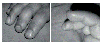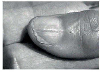 Nail growth depends on factors such as sex, age and habits; the growth rate is approximately 0.1 mm/day (0.5 mm/week) 1,6,11. Most nail injuries are caused by crushing trauma 2-4.11; in approximately 50% of cases, the lesions are associated with phalangeal fractures or damage of the soft tissue of the fingers. After a trauma, the nail stops growing for about three weeks, then an increase in the growth rate is seen over the next 50 days and, finally, a slow growth is observed for 30 days more; growth returns to normal 100 days after the trauma 1,6. During this period, a cross thickening of the nail represents signs of previous trauma (Beau's line).
