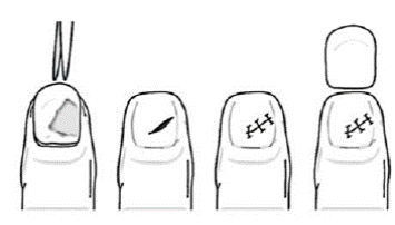 The wounds that compromise the paronychium, the hyponychium or the eponychium should be sutured carefully. Sometimes, it is impossible to recover the nail, which makes a temporary replacement necessary for about two to three weeks, as it will prevent adhesions at the bottom of the eponychium and throughout the matrix during the healing process.