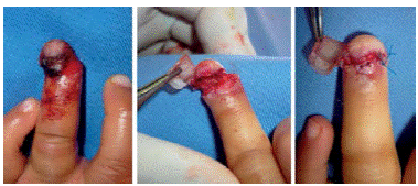 Besides the treatment described for lesions of the nail matrix and surrounding tissue of the nail, and according to the injury in the soft tissue, a simple suture should be done using local advancement flaps, such as VY, or a bit more complex flaps such as homodigital or heterodigital neurovascular island flaps 20,26-38 (Figure 8 and 9). This must be done by a specialist, but while the type of procedure is determined, the finger should be washed with a local anesthetic and covered with lubricated plasters.