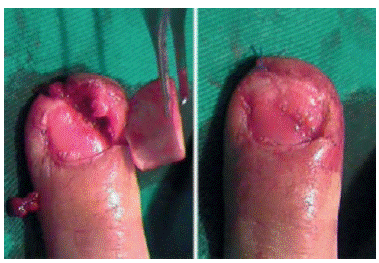 The loss of the nail bed may occasionally occur, which is solved through a flap in the matrix of the same finger, if necessary. Grafting from the nail matrix of the big toe or adipose flap rotation must be used when large losses occur 6,7,19-21.