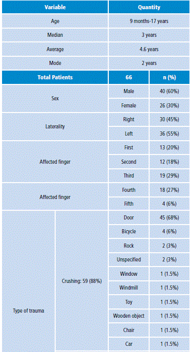 66 children, with an average age of 4.6 (age ranged from 9 months to 17 years), who suffered from fingertip injury were studied. 60.3% were male, 55% of the cases occurred in the left hand and 29% in the third finger. 88% of cases were related to traumas caused by crushing (68% corresponded to closing doors), thus becoming the most frequent injury (Table 1).