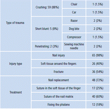 Conclusion: Fingertip crush caused by closing doors was the most frequent injury, which implied a higher involvement of the nail. An adequate treatment focused on the anatomic repair of the nail bed, the relocation of the nail plate and, in some cases, the use of flaps to cover defects in the soft tissue is ideal for this type of injuries, and must be provided as fast as possible to avoid secondary deformities.