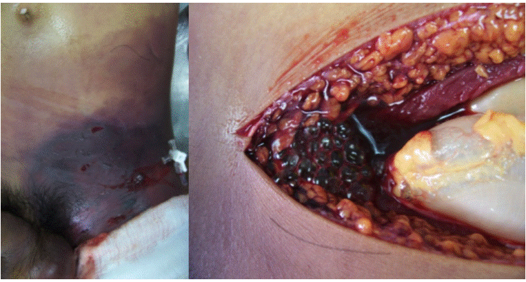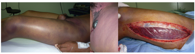 In the operating room, increased mottling purple coloring and extension to the lower abdomen and right thigh was observed, along with blebs of serohematic not fetid content in the inguinal region and presence of marked edema in the left scrotal sac (Figure 2); after examining the subcutaneous tissue and fascia, abundant gas production, thrombosed venous vessels of small caliber, marked tension in the lateral compartment of the left thigh with full pressure in the vastus lateralis when cutting the fasciae latae were found.