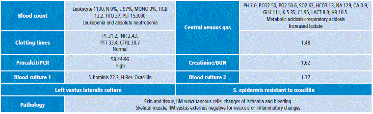 On admission to the emergency room, the respiratory rate was 23 breaths/min, the heart rate of 112 beats/min, body temperature of 38°C and blood pressure of 105/74mmHg; the left inguinal region presented erythema, limbs with edema, cyanosis and erythema, crackles in the left lower limb in its entirety, capillary filling greater than three seconds, difficult palpation pulse and no other abnormalities on physical examination. Gas gangrene was considered and antibiotic treatment was administered with vancomycin and meropenem, as well as analgesia with morphine.
