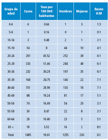 En Bogotá, D.C., para el año 2012 se registró una tasa de prevalencia de VIH aproximada de 19 por 100 000 habitantes, 1 485 casos (1 255 en hombres y 230 en mujeres) y una razón hombre: mujer de 6H:1M. El mayor pico de prevalencia se encontró en el grupo de 25 a 29 años con tasa de 51.5 por 100 000 habitantes, seguido por el de 20 a 24 años con 45.2 por 100 000 habitantes y el de 30 a 34 años con 36.3 por 100 000 habitantes (Tabla 1 y Figura 1).