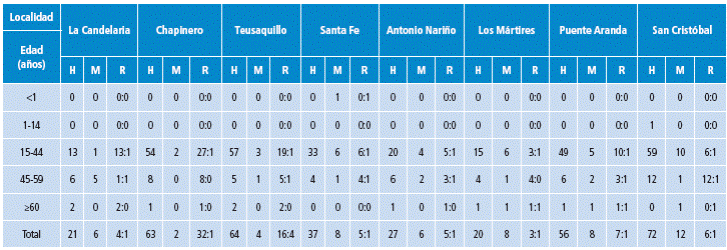 Usme y Fontibón fueron las localidades de menor tasa de prevalencia. En estas, junto con Kennedy, Engativá, Los Mártires y Rafael Uribe Uribe, la población más afectada correspondió a grupos de edad entre los 20 y 39 años.