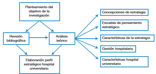 Estudio descriptivo con enfoque cualitativo. Se realizó una revisión para detectar, obtener y consultar la bibliografía y otros materiales útiles para los propósitos del estudio, extrayendo y recopilando la información relevante y necesaria frente a los conceptos de estrategia y gestión estratégica que pudieran ser aplicados al entorno hospitalario 19. Más allá de una compilación de información, se realizó un análisis y síntesis crítica de la misma para poder encontrar asociaciones de significados 20.