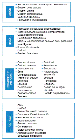 Al examinar las instituciones seleccionadas se encuentra que analizando la misión, visión, valores y políticas de estos hospitales hay una orientación hacia el cliente externo o hacia los procesos (Figura 2) y se destaca el hecho de que, al menos de manera nominal, en ellos está presente la necesidad de tener talento humano calificado y comprometido para la prestación de los servicios, así como de otras capacidades internas.