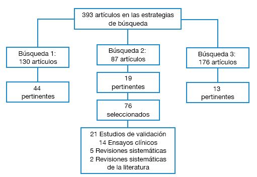 Los 76 artículos seleccionados se distribuyeron entre los investigadores vinculados al estudio, quienes diligenciaron la tabla que resumía las características más importantes de los mismos; a partir del análisis por parte del grupo en pleno se evaluó la pertinencia de las publicaciones para ingresar en esta revisión. Cada uno de los autores evaluó por separado los artículos según los criterios mencionados y se compararon cuando había discordancias, en cuyo caso se resolvió la situación por medio de un consenso entre los investigadores. Al final, se incluyeron 21 estudios de validación de instrumentos, 14 ensayos clínicos, 5 revisiones narrativas y 2 revisiones sistemáticas de la literatura. En la Figura 1 se muestra el proceso de selección de los artículos.