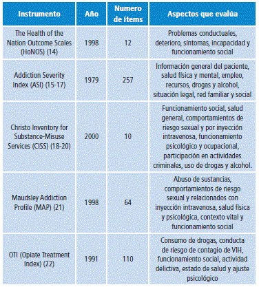 La medición en diferentes momentos del tratamiento del uso de sustancias, la estabilidad psicosocial, la criminalidad, el riesgo de contagio de virus sanguíneos y la salud física y psicológica son aspectos comunes en los instrumentos revisados, sin embargo se encuentran diferencias relacionadas con la combinación de dominios, la escogencia de escalas, el tiempo y el método de compleción. Estas características deben ser consideradas por el clínico o la institución a la hora de elegir un instrumento en particular.