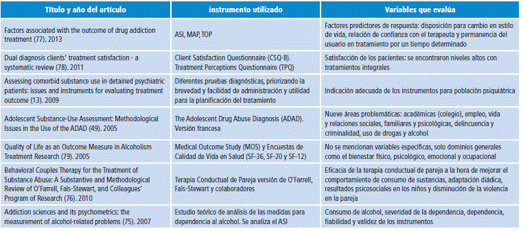 Dos estudios se ocuparon de instrumentos para medir la calidad de vida, los cuales se pueden utilizar para evaluar resultados de tratamiento en determinadas condiciones o simplemente para caracterizar los pacientes con TUS o las personas que han realizado tratamientos. Estos artículos validan los instrumentos Alcohol Dependence Quality of life (ALQoL9) 43 y World Health Organization Quality of Life assessment (WHOQOL-BREF) 44.