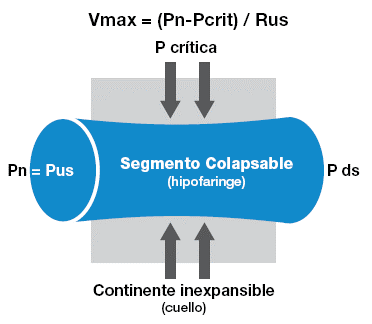 Para comprender el dinamismo de la VAS se tiene que entender el modelo de Starling (Figura 1), donde la vía aérea -a nivel de la hipofaringe- es un tubo colapsable al interior de una cámara rígida -región cervical-. La presión por arriba de la faringe equivale a la atmosférica y la porción por debajo a la traqueal. Al mismo tiempo, se generan dos tipos de presiones: la intraluminal, que tiende a abrir la VAS, y la extraluminal, que tiende a cerrarla; la diferencia entre estas dos da como resultado la presión transmural, que determina el diámetro de la VAS 10-12. La presión a la cual se genera una obstrucción o colapso se llama presión crítica, siendo más positiva en pacientes con SAHOS que en individuos sanos 7.