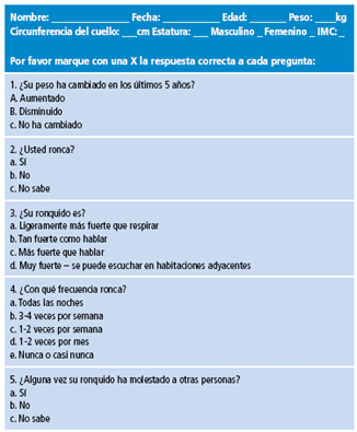 El Cuestionario de Berlín es un instrumento de tamizaje para el SAHOS diseñado en 1996 por un grupo de 120 médicos reunidos en Berlín (Figura 1). Esta herramienta incluye una información introductoria y 10 preguntas organizadas en tres categorías: la primera categoría consta de cinco preguntas e involucra el ronquido y los episodios en los que se suspende la respiración, la segunda consta de cuatro preguntas y abarca la somnolencia diurna y la tercera consta de una sola pregunta y se relaciona con la hipertensión arterial y el IMC. Cuando 2 de las 3 categorías son positivas, los pacientes se clasifican de alto riesgo; para el resto de resultados, los pacientes son clasificados como de bajo riesgo.