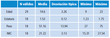 De los 29 deportistas, 13 eran mujeres, equivalente al 44.82% y 16, hombres, equivalente al 55.17%; las características morfológicas y de edad se resumen en la Tabla 1.