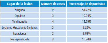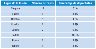 El hombro es el lugar de lesión que más sobresale con cinco casos, lo que representa el 17% de las lesiones. Le sigue la rodilla, con tres casos correspondientes al 10.3% de las lesiones y, en tercer lugar se encuentra la cadera, con dos casos equivalentes al 6.8% (Tabla 2).