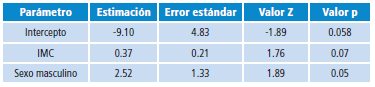 Al controlar por IMC se observan riesgos diferentes para hombres y mujeres (Tabla 4). Con el valor de la estimación se puede ver que por cada unidad de IMC que se aumenta, se incrementa el odds en un 37%. Al exponenciar la estimación de 2.52, se obtiene un valor de 6.85. Esto expresa el odd ratio, que manifiesta que el género masculino tiene 6.85 veces más riesgo de lesión que las mujeres pertenecientes a la misma clasificación del IMC.