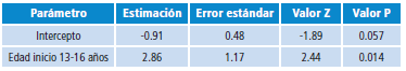 A propósito de la relación entre edad de inicio y número de lesiones, se observó que 21 deportistas iniciaron su práctica entre los 9 y 12 años, mientras que ocho deportistas iniciaron de los 13 a los 16 años. Se construyó un modelo de regresión logístico para explicar la probabilidad de que un deportista tuviera una lesión en el último año, mediante la variable explicativa edad de inicio, dicotomizada en las categorías de inicio antes de los 13 y su complemento. Cabe notar que la variable inicio es altamente significativa en la explicación de la probabilidad de una lesión (valor p=0.014). El signo positivo del coeficiente indica que quienes empiezan a una edad mayor tienen una mayor probabilidad de lesión (Tabla 5). Al exponenciar la estimación de la edad de inicio, da un valor de 7.77. Esto indica el número de veces de riesgo mayor para sufrir lesiones en los que inician entre los 13 y 16 años.