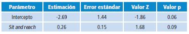 En el sit and reach, la variable es significativa al 10% e indica una ligera relación positiva entre los más flexibles y la probabilidad de lesión, con una estimación del 0.26. Esto muestra que para esta población, el aumento de un centímetro de la prueba tiene un incremento de 26% del número de deportistas lesionados por uno no lesionado. Este resultado ha sido explicado por varios estudios de ensayos clínicos y revisiones sistemáticas, cuyos resultados muestran que la flexibilidad estática antes del ejercicio no previene las lesiones y ser flexible no es un factor protector; al contrario, en muchas ocasiones, es un factor de riesgo 28-33.